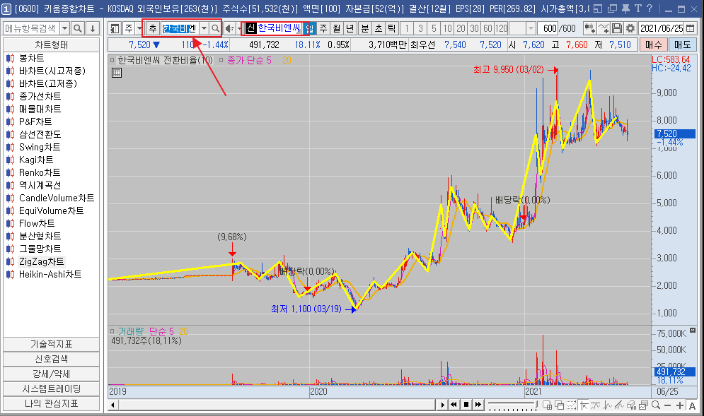 저의 경우는 한국비엔시가 원래 창에 있고, "추"로 변경 후 종목검색에 한국 비엔씨라고 적고 엔터"