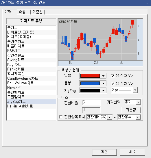 - 2번 누르면 봉차트에 지그재그 차트가 나옵니다.