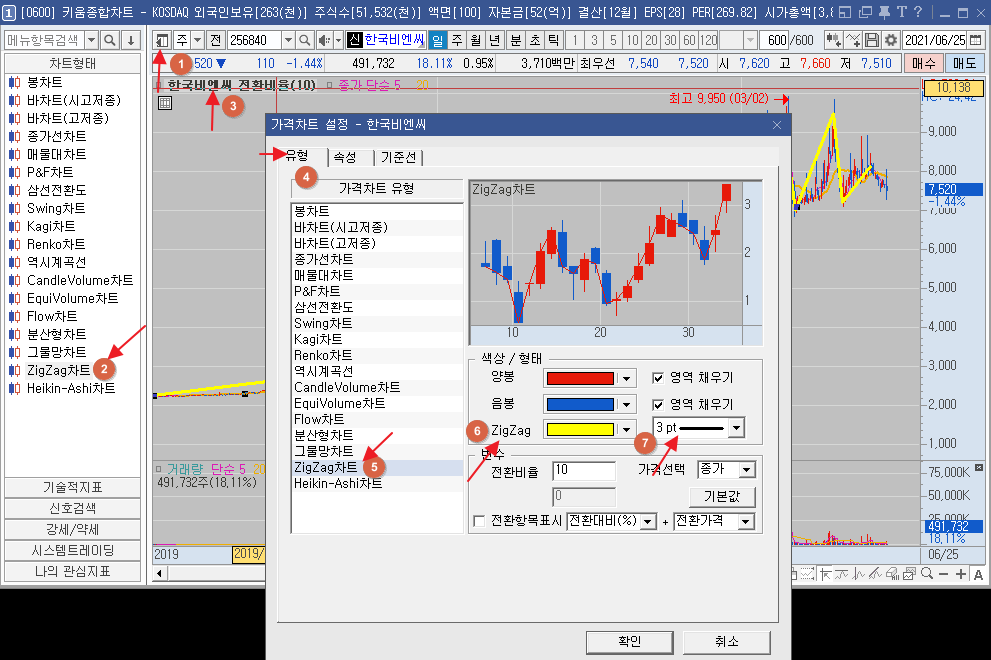 - 4번으로 가서 5번클릭, 6번으로 가서 지그재그 차트의 색과 굵기를 설정합니다.