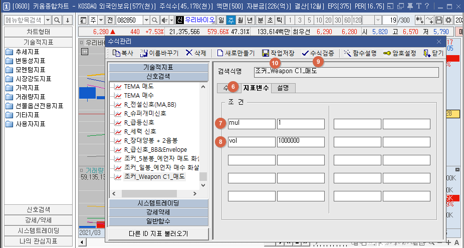 그리고 지표변수에 mul 이 있줘. 곱셈으로 기본을 1로 했는데 좀더 빠른 매도 신호를 원하시면 mul을 1보다 작게해서 사용하시면 됩니다.