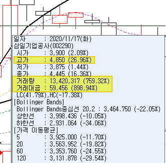 [1] 일봉 또는 60분봉으로 대량 거래량이 들어온 날의 정보를 확인합니다. 장대 양봉에 마우스를 가져다 가면 정보가 나오니 참고하세요.