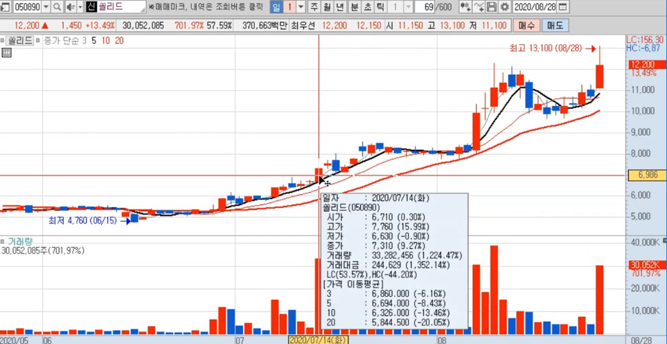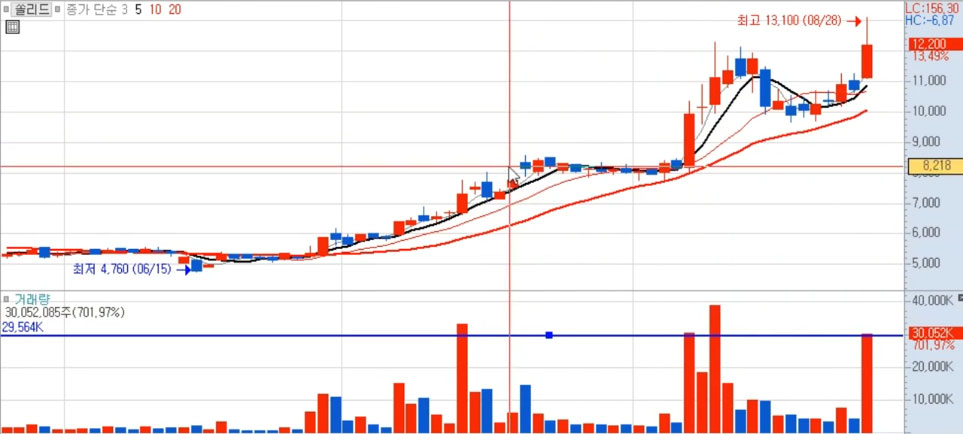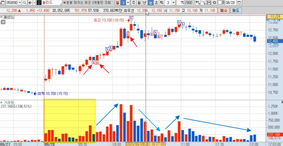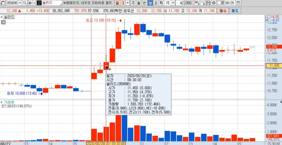 솔리드란 종목을 한 15분쯤에 발견을 했다면, 처음에는 1봉 정도는 관망을 합니다. 거래량이 얼마나 올라오
