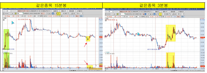 현재의 거래량이 이 주식의 살아온 기간대비 얼마나 큰 것이가를 판단해야 합니다. 제가 보여드린 차트는 5분 3분봉 기준이라 오른쪽 그림을 보시면 거래량이 대단히 많은 것으로 보이지만 왼쪽 15분봉 차트를 보면 녹색부분이 과거의 많이 거래량이며, 노란색부분이 현재의 거래량 즉 오른쪽의 3분본 거래량입니다. “오른쪽의 차트의 거래량이 결코 큰 거래량은 아니다 라는 것을 알 수 있습니다.”