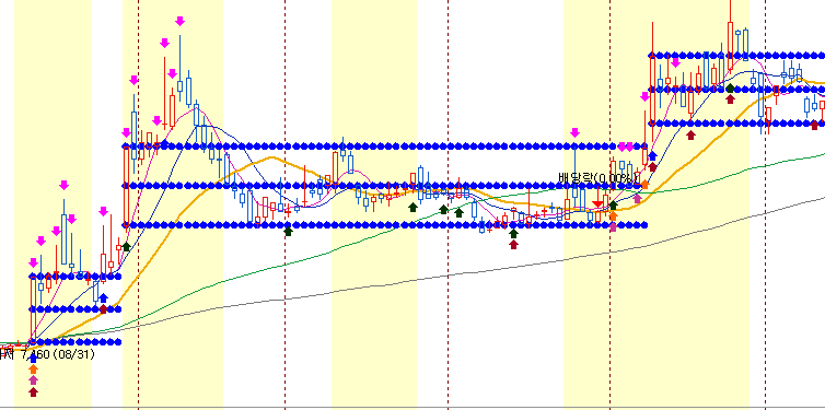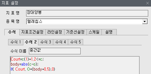 뭔가 장대 양봉에 점이 3개 찍혀 있네요. 맞습니다. 소히 기준봉이라고하는 장대 양봉입니다. 수식을 보시면 아시겠지만 20%이상 급등한 장대양봉의 최고값 중간값 시작값을 점으로 표시하였습니다.