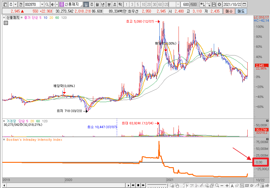 자. 잘 들으세요. 거래량지표라고 했줘, 그 중에서 BII는 큰손의 움직임을 알 수 있습니다. 제가 어느 근거로 그럴까요? 여러분 주식이 BII의 0선기준 위와 아래를 잘 보셔야 합니다. 0선에 걸쳐 있다는 것은 개미 입니다.