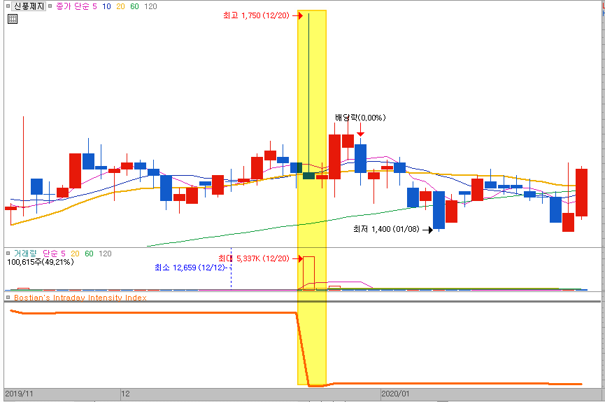 어느정도 주가가 올라 왔지만 2번 구간에서 BII 지표가 0 이하로 떨어지기 시작합니다. 왜 일까요?? 일봉 상으로는 아무 변화가 없는데 BII 지표가 내려갔지요?? 저길 크게 확대해서 보면 배당락이 발생하기 3일전에 물량 테스트가 일어납니다.