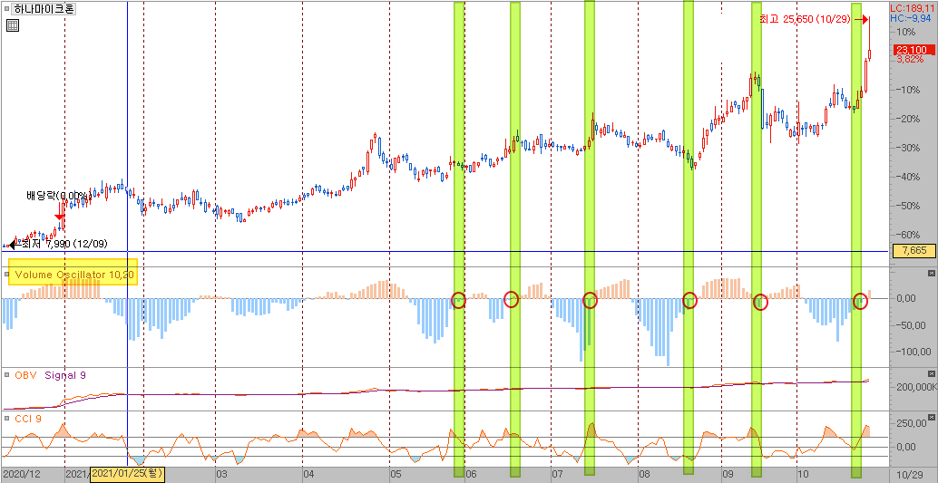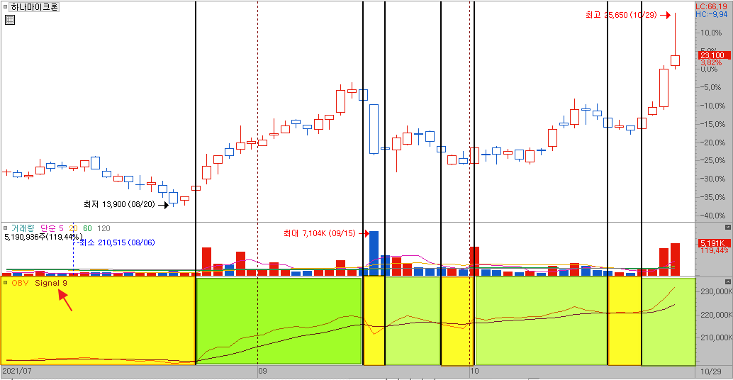1. 녹색은 OBV가 signal 9 를 돌파 후 위에 있을때 구간입니다.