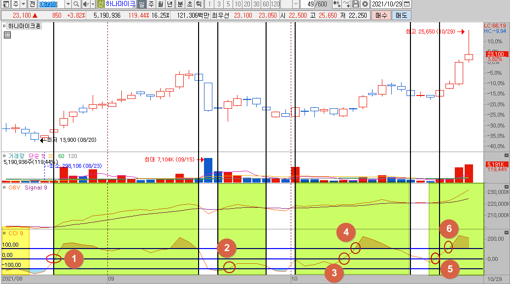 6. 여섯째 보시면 OBV가 Signal 9선 위에 있으면서 동시에 CCI 100 선을 돌파 합니다. 매수 시점