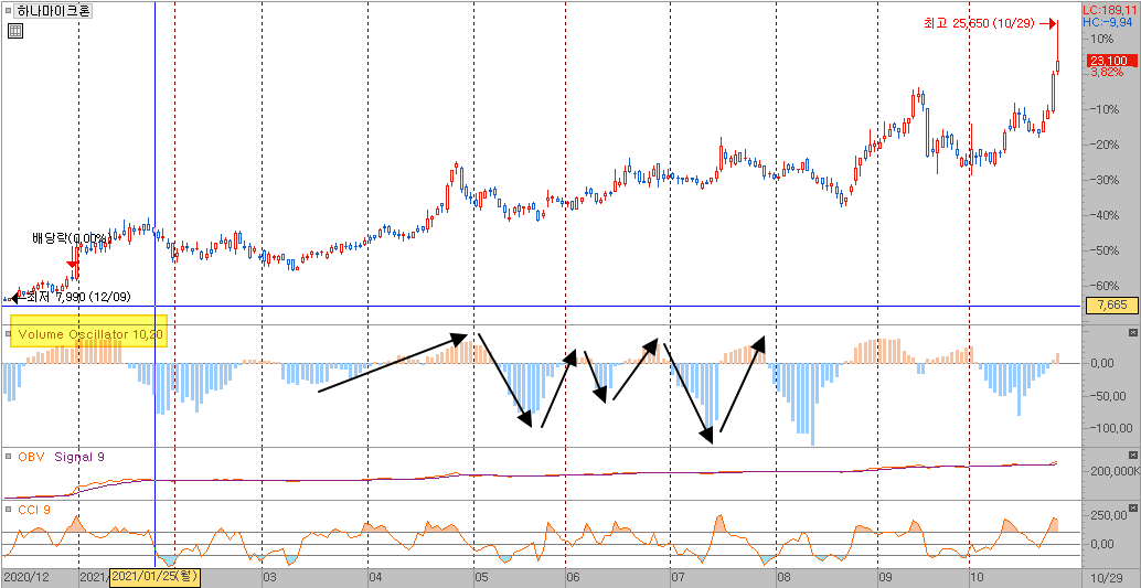★ 볼륨 오실레이터의 경우 빨간색 막대의 최고 값이 바로 고점이며 상투가 시작되는 시점입니다.포