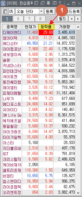 자 그럼 관심종목창이 어떻게 변한지 볼까요? 아래와 같이 됩니다. 그럼 등락률을 눌러서 오름차순으로 세팅을 합니다.
