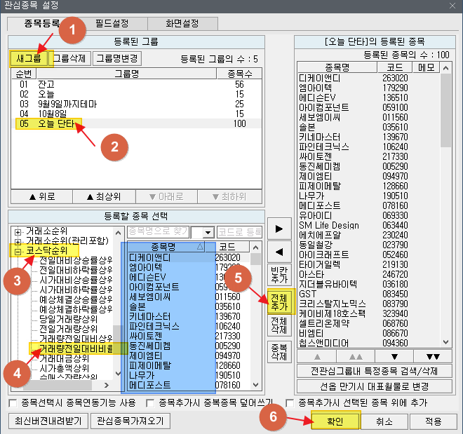 ◇ 6번과 같이 확인 누르면 "캬" 오늘의 주도주 세팅이 끝납니다.