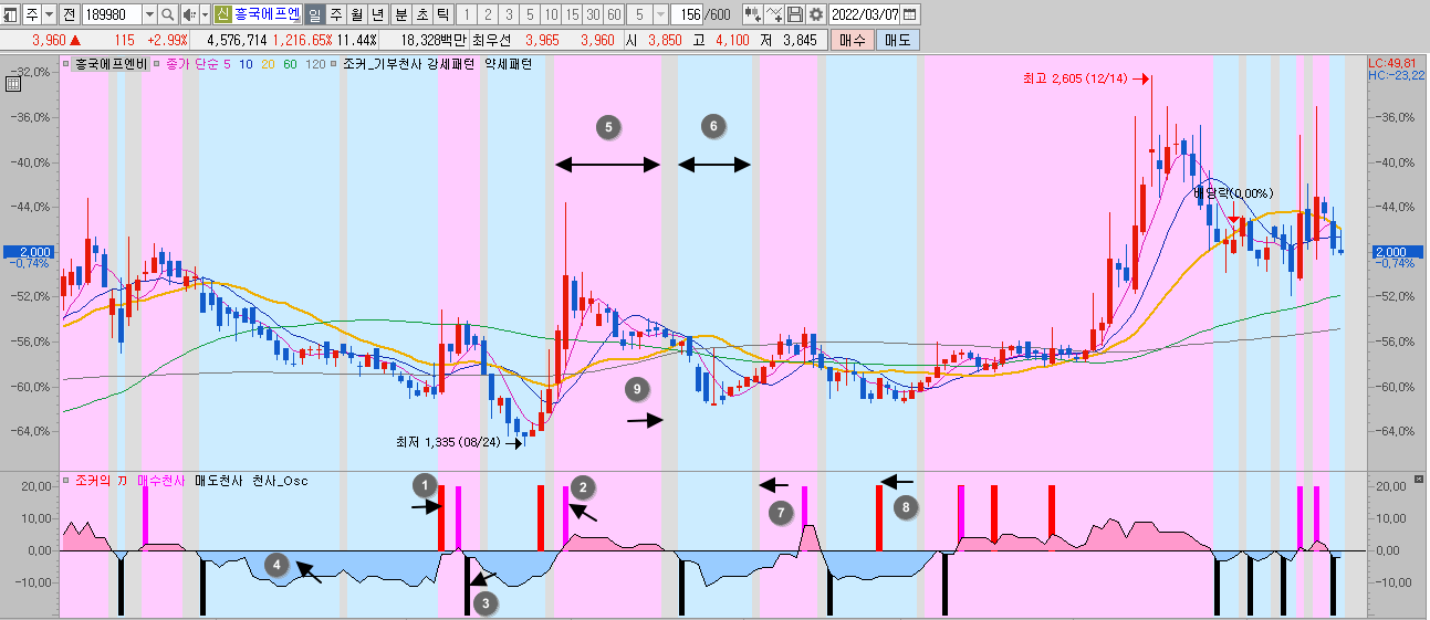 천사 Osc를 기반으로 강세, 약세 구간을 차트 전체로 구분함. |
