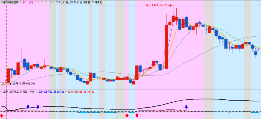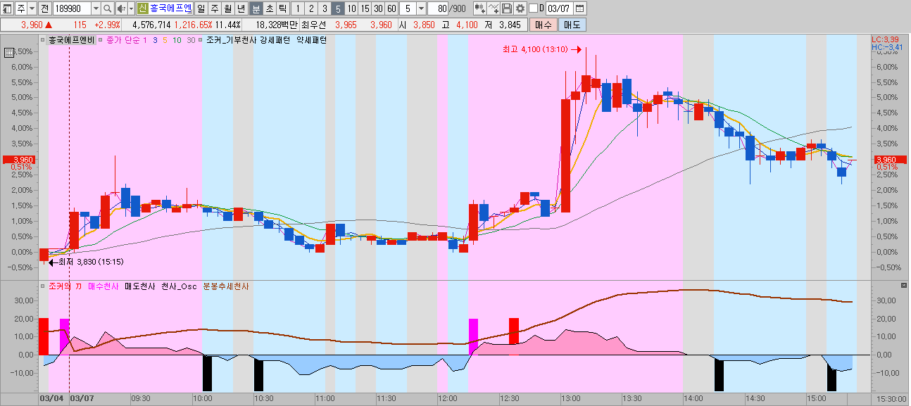 [분봉] 분봉은 말씀드렸듯이 오늘의 추세가 강한지 약한지를 알 수 있는 지표가 하나더 들어 갑니다.