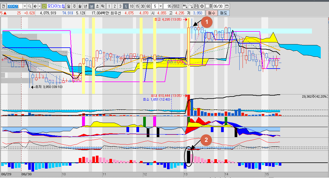 오늘은 고가 경고 및 저가 매수에 대한 보조 막대지표 만들다가 4번 실패하고 5번째 성공한 것을 알려드리려 합니다.