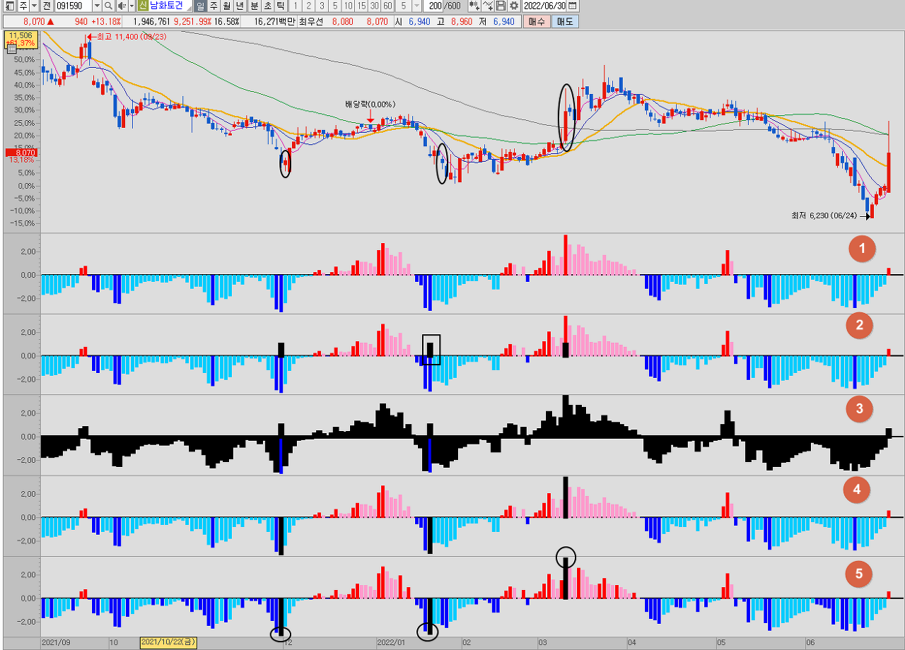 이놈은 고점과 저점을 징후를 찾기 위해서 만든 놈이구요, 즉 검은색 장대막대가 나타난 후 큰 변화가 생기기 시작합니다. 물론 보조지표들의 이해가 충분해야지 만들고 사용하지 그렇지 않으면 무용지물 입니다.