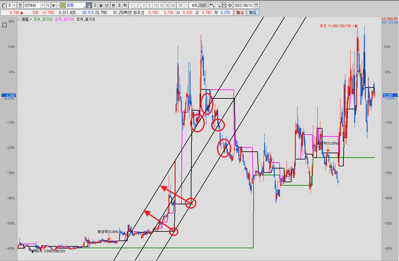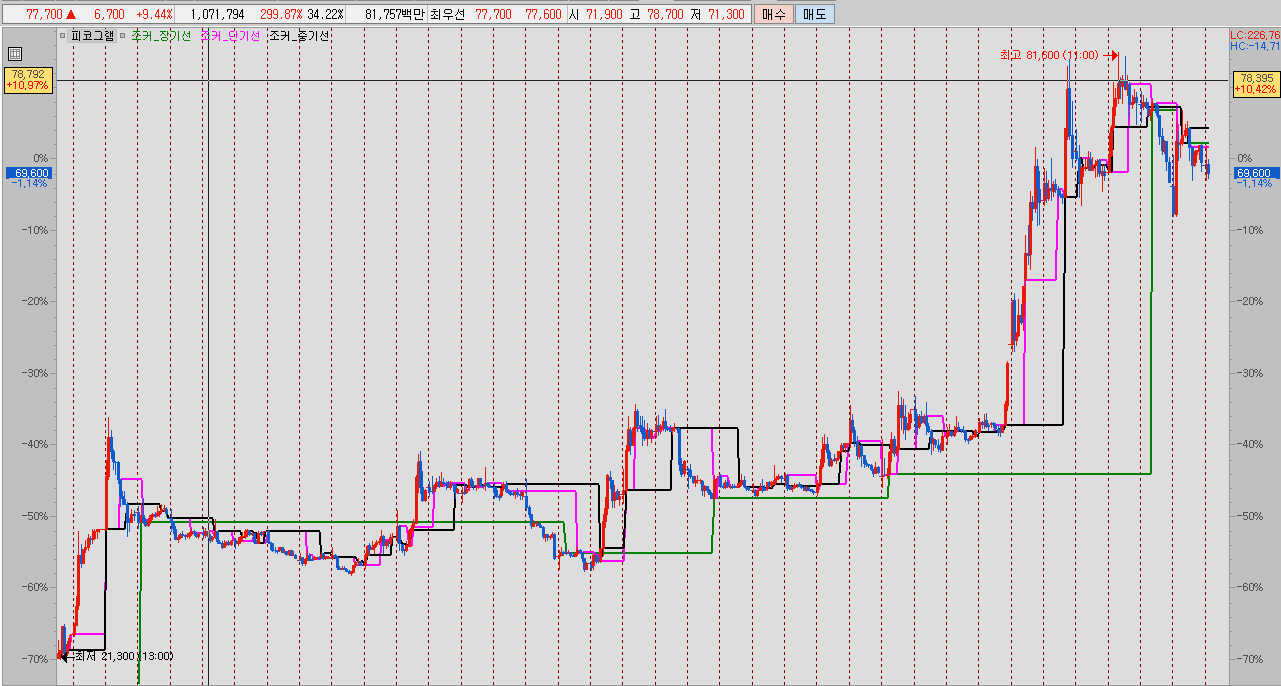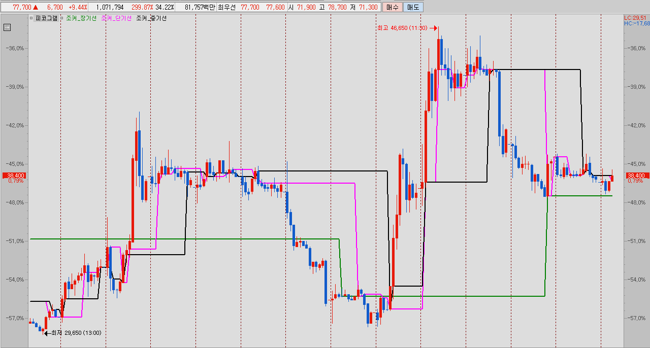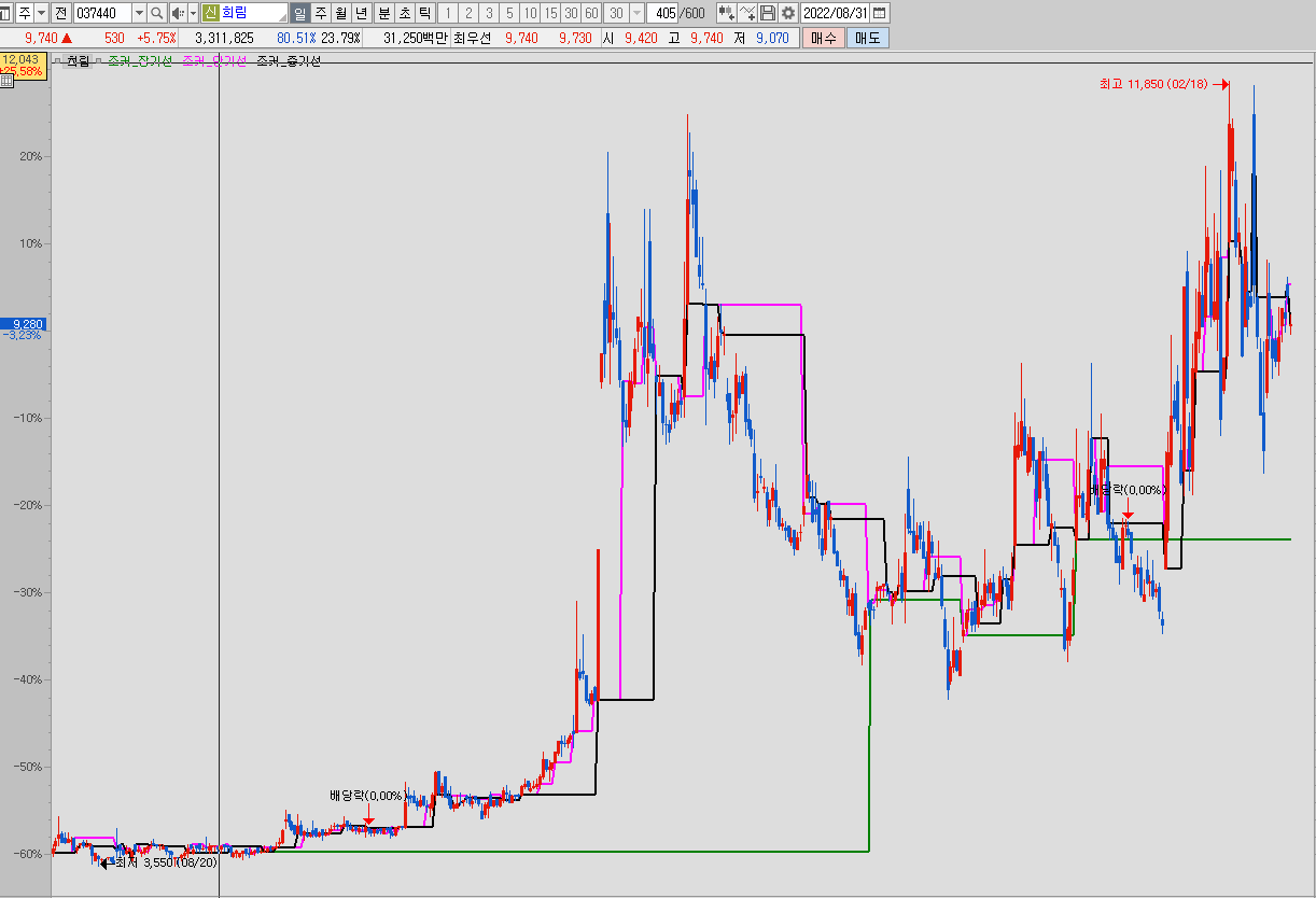 단기선을 보니 중기선 위에서 오락가락 하고 있지요. 일일 단타로 사용 가능하겠네요.