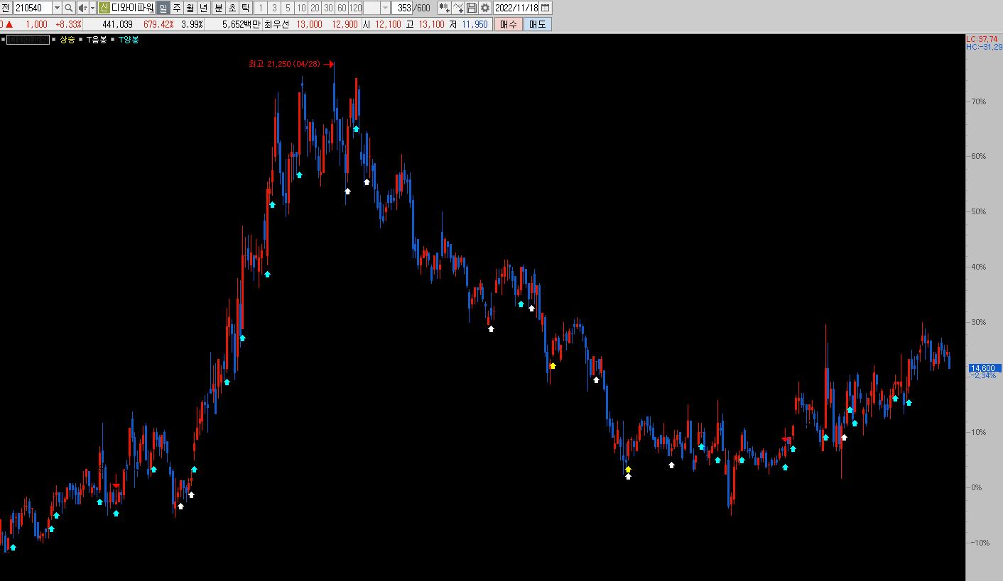 사실 오늘에 주인공은 이놈 입니다. 흰색 화살표는 추세가 시작하는 단계에 나타나는 신호 입니다. 보통 무릅에 사서 어깨에서 팔라고들 하죠. 이놈은 발목쯤에서 잡을 수 있는 기능이 있습니다. 대박이지요. |