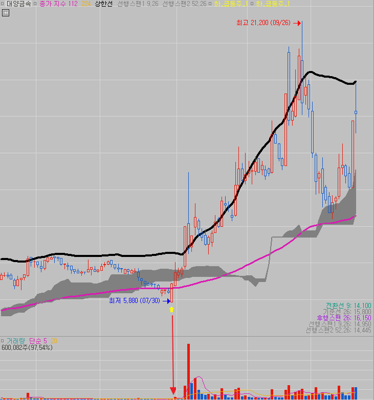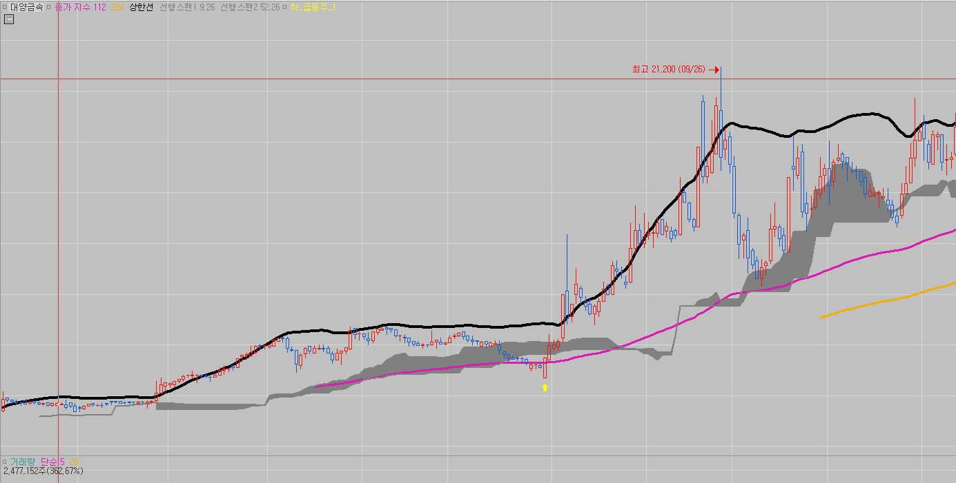 윗 글까지는 거래량이 없었고 평균이동 120일선이 금일 시가를 상향돌파 했을때 화실표가 표시되어라 였줘.