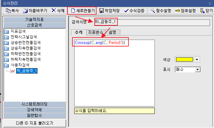 - 수식에서 Crossup(C, avg(C, Period1)) 적는다.
