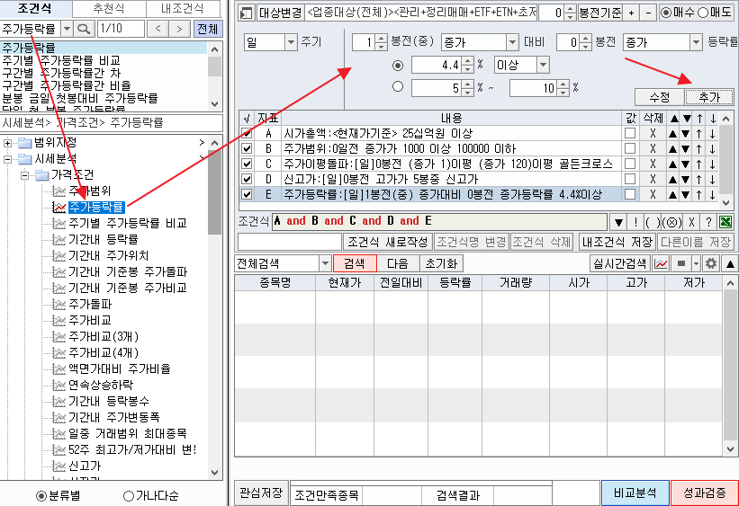 그럼 이전에 소개드린 급등주 화살표와 맞게 조건 검색식을 만들어 줍니다.