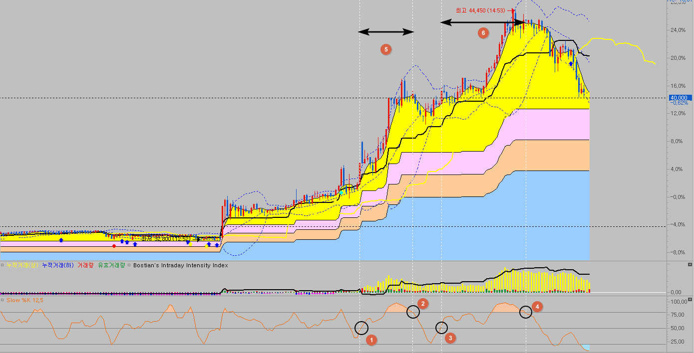 4. 그리고 마지막으로 스토캐스틱 %K 만으로 50을 돌파하여 과열을 지나서 과열이탈하는 구간까지 봅니다.