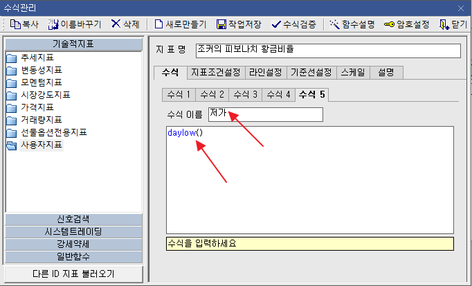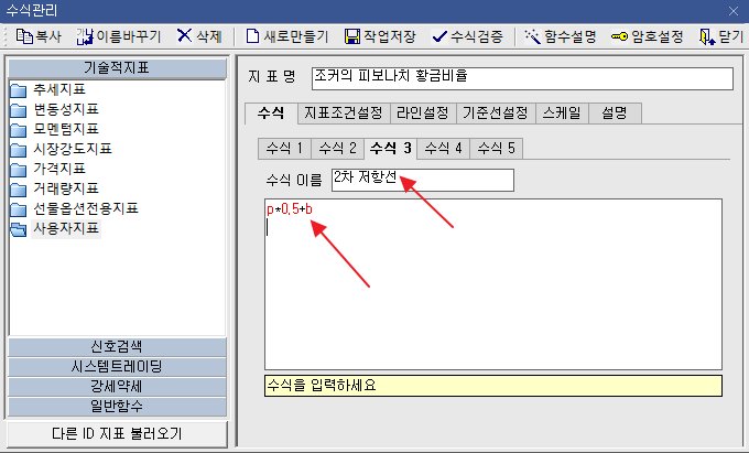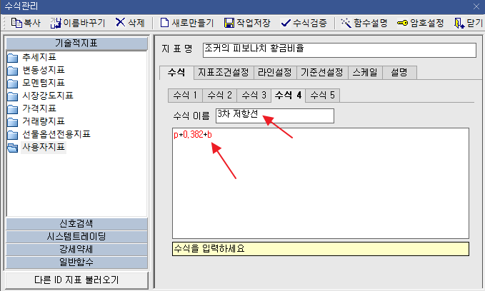 | 7 | 수식2에 수식넣기 | 1차 저항선 입니다. 현재까지의 고가와 저가를 뺀값에 0.618*저가를 한 값입니다. ![]() |