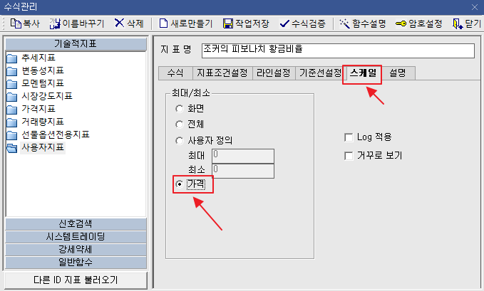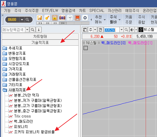 그럼 사용자 지표를 누르고 조거의 비보나치 황금비율을 클릭 하시면 됩니다.