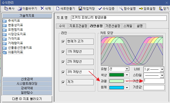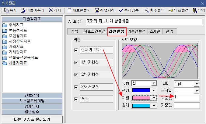 | 11 | 라인설정 설정 | 이제부터 지표 조건입니다 간단히 말씀 드리면, 각 황금라인별로 바탕색을 만들어 구별시켜주는 단계 입니다. 반드시 기준값을 1로 하셔야 합니다. |