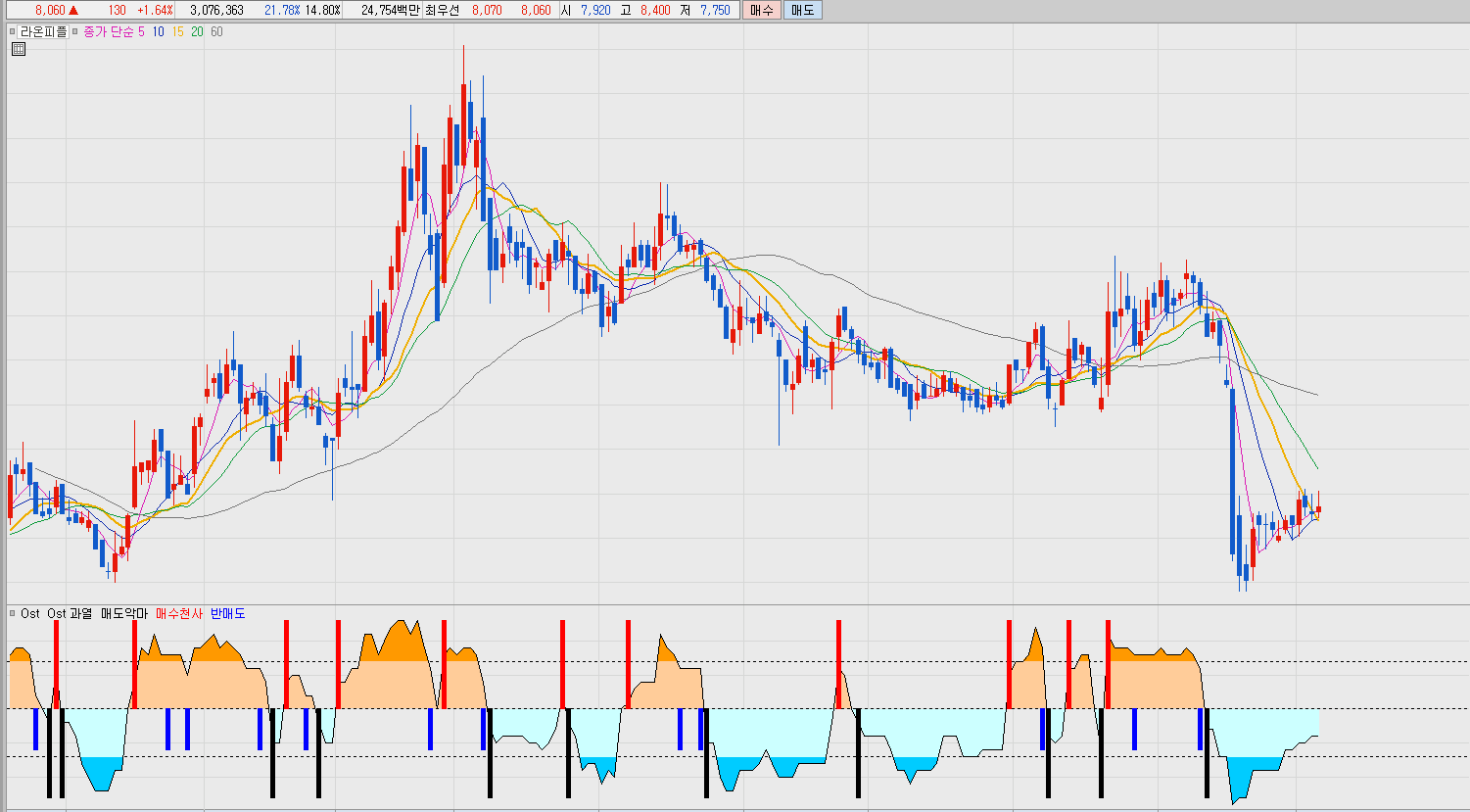 확대해서 보시면 매수와 매도(반매도포함) 시기를 정확하게 알 수 있구요, 상승세와 하락세의 구분까지 하여서 직관적으로 만들었습니다.