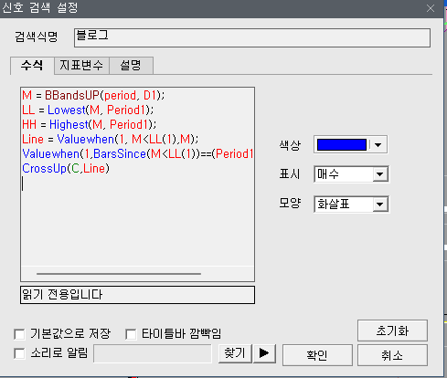 | 수식 | M = BBandsUP(period, D1); LL = Lowest(M, Period1); HH = Highest(M, Period1); Line = Valuewhen(1, M<LL(1),M); Valuewhen(1,BarsSince(M<LL(1))==(Period1-k),Line); CrossUp(C,Line) ![]() |