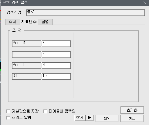 | 지표변수 | 변수는 아래와 같아요 ![]() 제가 위치에 따라서 골라 먹는 재미가 있다고 했죠. Period1 은 고가 저가의 일수를 말하구요. 5일동안으로 고가저가입니다. 이걸 10으로 바꾸면 10일동안이죠. Period 는 볼밴의 일수 입니다. 보통 20 쓰시는데 신호가 자주 나오는 걸 방지 30, 40 등 여러가지로 사용해 보시구요. D1은 표준편차 값이니 1.8 이나 1.9 등으로 미세 타점 조정해 보시기 바랍니다. |