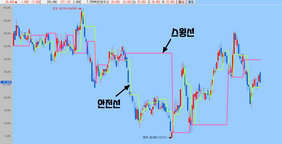 스윙선 위에서 춤추는 안전선이 보이실껍니다. 스윙에서도 매수 매도 구간이 있죠. 완벽히 조화를 이루죠.