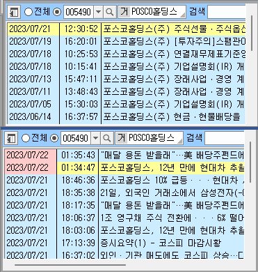 당신이 포스코올딩스가 궁금해서 차트에다가 포스코홀딩스 쳤다면 아래와 같이 포스코 홀딩스에 대한 공시가 다 나옵니다.
