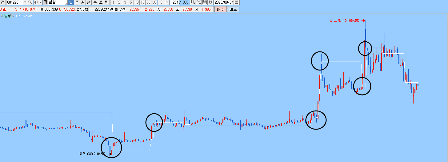 2. 크게 선이 위로 움직였을때 ▶ 상방변곡 지점 (매도타점)