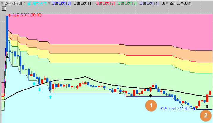 | 4 | 저 같은 경우는 간단한 신호검색을 만들어서 5분봉에서 30일 이평선을 돌파시 검은색 선이 나타나도록 했습니다. 그래야지 몇번째 돌파인지 확인이 쉽기 때문이니다. |