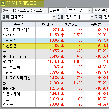 | 2 | 거래량 급증 창을 하나씩 열어 봅니다. 저는 화신정공을 열어보겠습니다. ![]() |